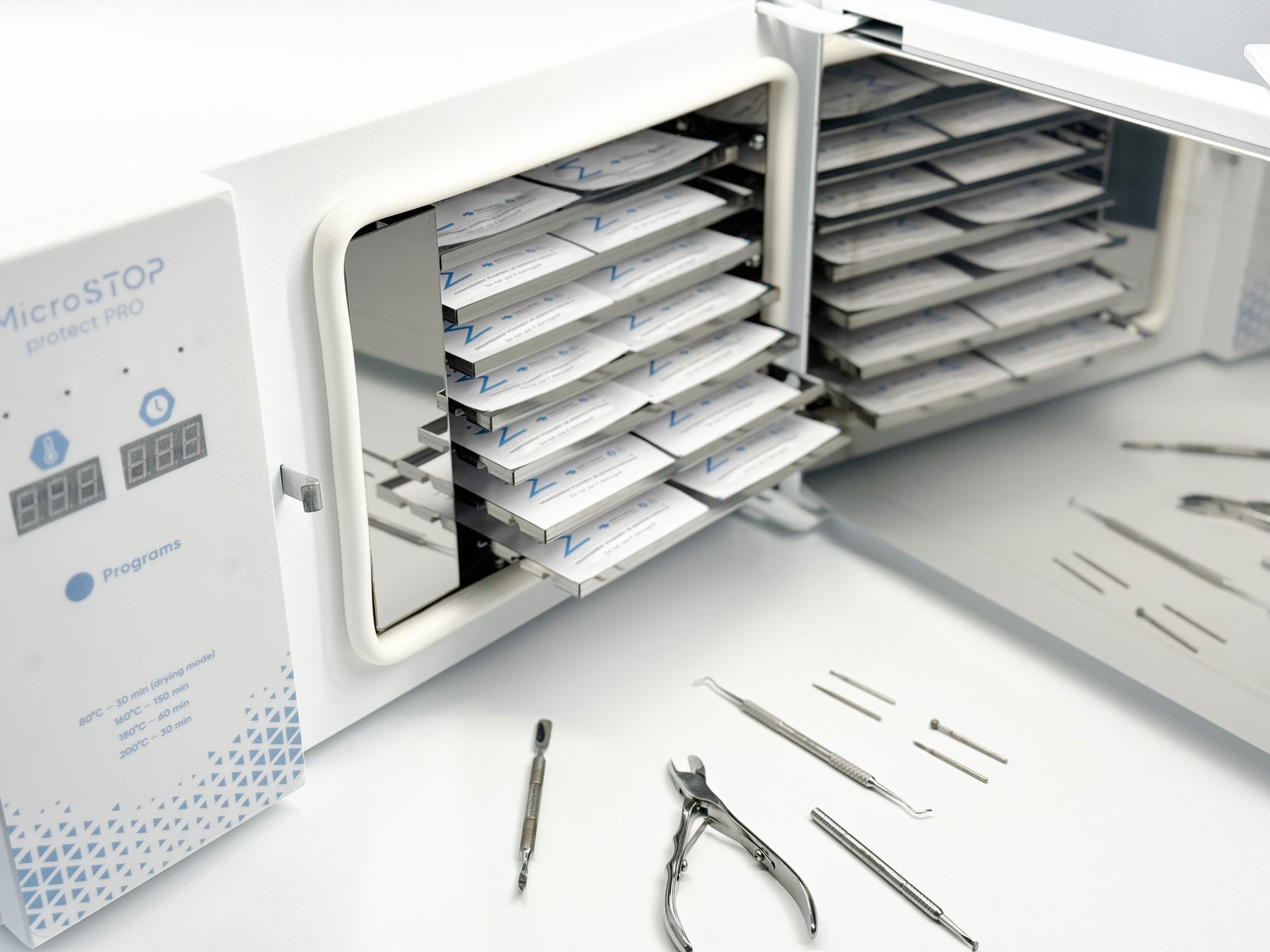 The Microstop Protect PRO is a professional-grade dry heat sterilizer designed for reliable and efficient sterilization of metal instruments used in beauty salons, medical offices, and dental or manicure studios. It combines high performance, durability, and modern design to meet the strictest hygiene standards.