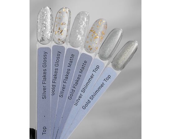 No-wipe top coat with sparkling foil particles. The particles distribute evenly, creating a flawless surface. It’s an ideal option for quick and elegant nail designs. After curing, the color of the coating remains clean, without any yellow tint.
