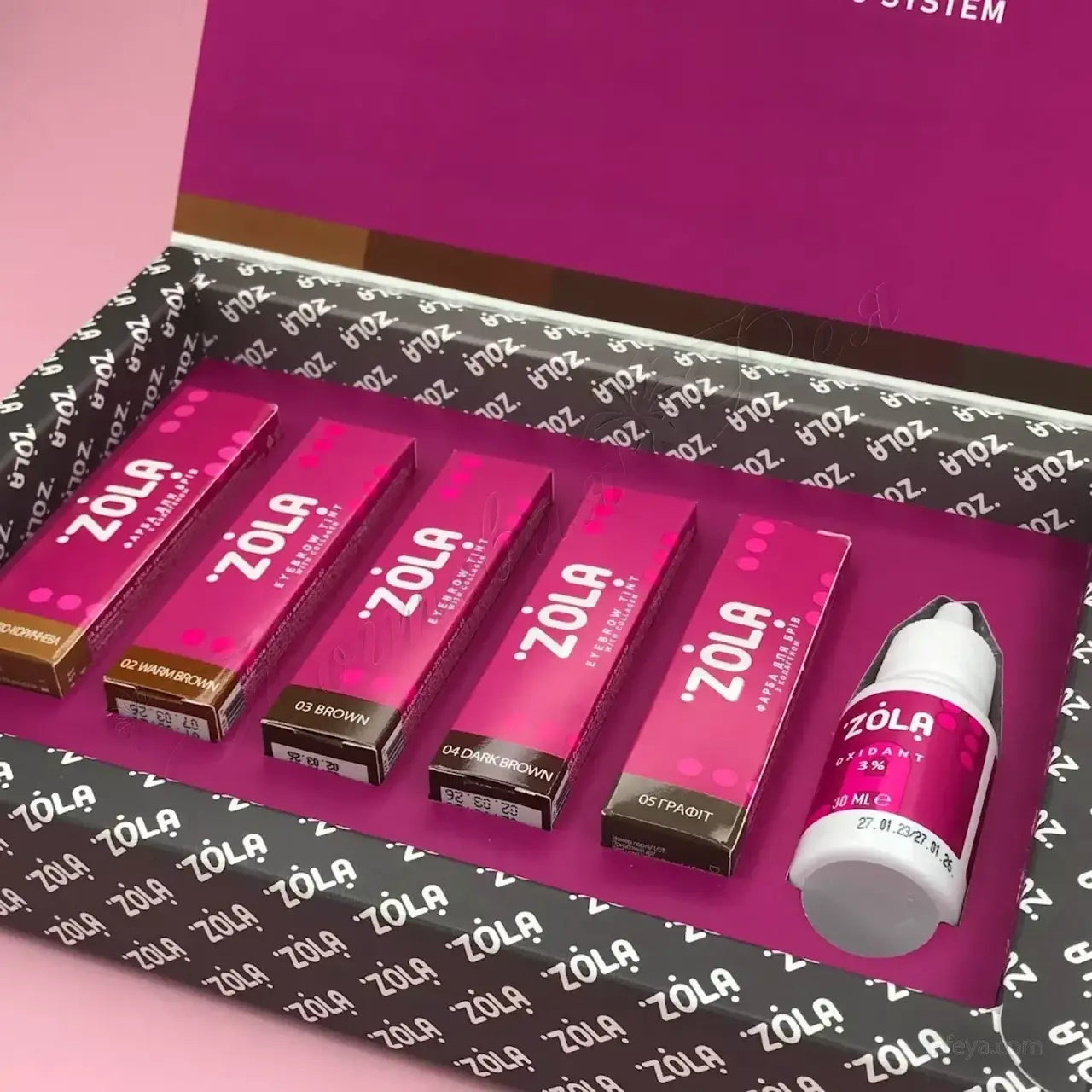 Набір з 5 відтінків кольору та окислювача. Перманентна фарба ZOLA якісно та безпечно фарбує брови, а завдяки корисним компонентам забезпечує догляд за бровами. Колаген зміцнює волосся, надає їм еластичність і блиск. Ланолін і зволожуючий сорбітол глибоко проникають у структуру волосся та інтенсивно зволожують його. Унікальний склад і пластинчаста текстура дозволяє створити якісний принт «ефект хни на шкірі». Фарба має м'яку консистенцію, легко розмішується і наноситься на брови. Інструкція по фарбуванню брів: Видавіть приблизно 1 см фарби і стільки ж ZOLA Oxidant 3% в пластикову або скляну ємність. Ретельно перемішайте суміш до однорідності. Час витримки 5-15 хвилин в залежності від бажаного відтінку. важливо! Час впливу відраховується від початку нанесення. Пропорція змішування 1:1
